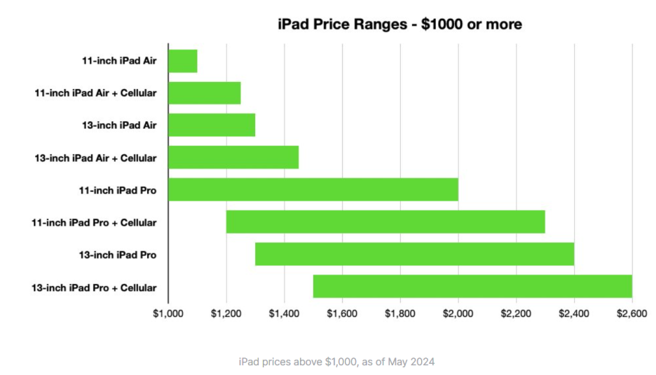 이 가격대 이후에는 iPad Pro 모델만 사용할 수 있습니다. 주요 고려 사항은 화면 크기, 용량 및 셀룰러입니다. 1TB 및 2TB 모델의 경우, 약 11만 원을 추가로 지불하고 나노 텍스처 유리를 추가하면 이미지 품질이 향상됩니다.