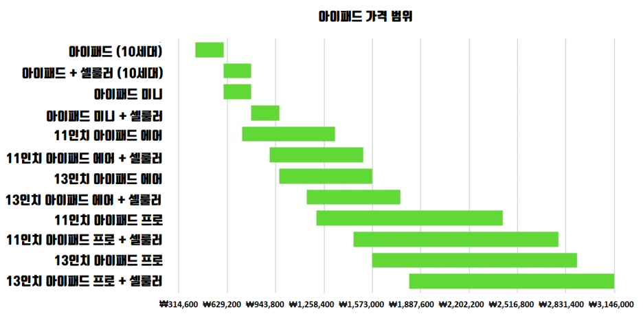 현재 앞으로 출시된 아이패드 에어와 프로 모델의 미국 현지 가격 정보를 반영해서 전체 가격 범위를 살펴보면 36만 4,800원에서 314만 6,000원까지 최저가와 최고가의 차이가 큽니다. 그만큼 본인의 사용 환경에 맞는 적절한 아이패드를 선택해야 합니다.